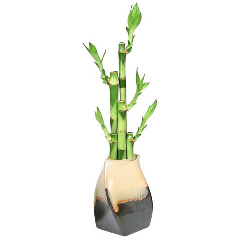 Beautiful Lucky Bamboo Plant Arrangement of 5 Straight Stalks planted in our exclusive Two-Tone Cream on Coffee Curve Twisted designed vase. Overall height of the arrangement is approximately 12 inches.Lucky Bamboo (Dracaena Sanderiana) does not require direct light so it will grow in places where sunlight is not available. Lucky Bamboo is very easy to take care of and will grow indoors for years with little or no care, requiring only enough fresh water to keep its roots moist at all times.For centuries, Lucky Bamboo plants have been given as gifts to friends and loved ones during times of celebration. A wedding, birthday, house-warming, new business venture or just an expression of wishing someone Good Fortune are all perfect times to give the gift of a Lucky Bamboo plant.